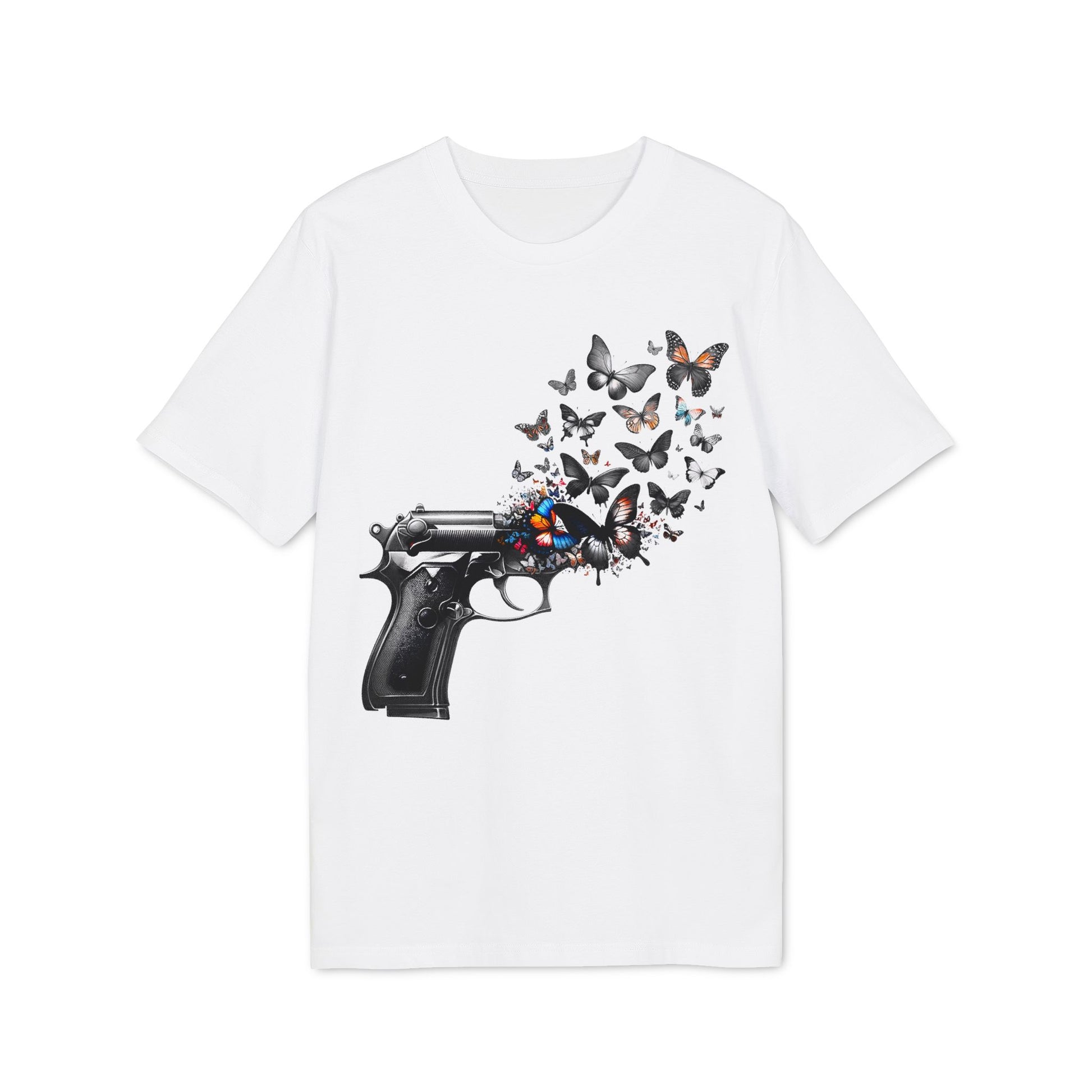 Showcase your commitment to peace with our "Butterfly Pistol Transformation" Tee, a symbol of anti-violence and artistic expression. This Graphic T-shirt, featuring a pistol transforming into vibrant butterflies, embodies a powerful No War message, making it more than just clothing—it's wearable art. Crafted from 100% cotton for comfort and durability, this Anti-War T-shirt stands out for its modern minimalist design and ethically grown cotton, ensuring sustainable fashion and ethical production. Ideal for those who value a No Violence stance, our unisex, soft-style tee offers a classic fit, easy comfort, and the versatility to suit any occasion. Embrace a statement of peace, artistry, and sustainability with every wear.